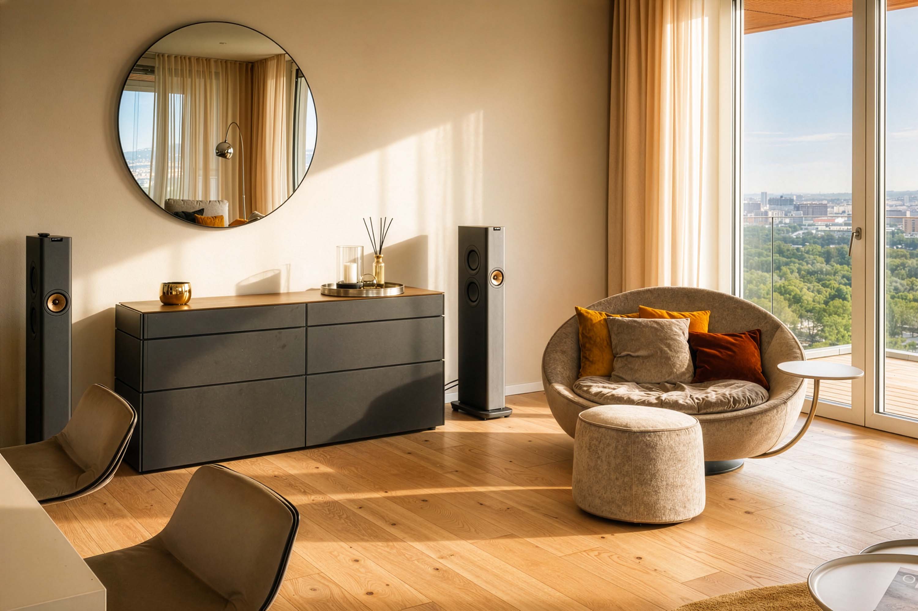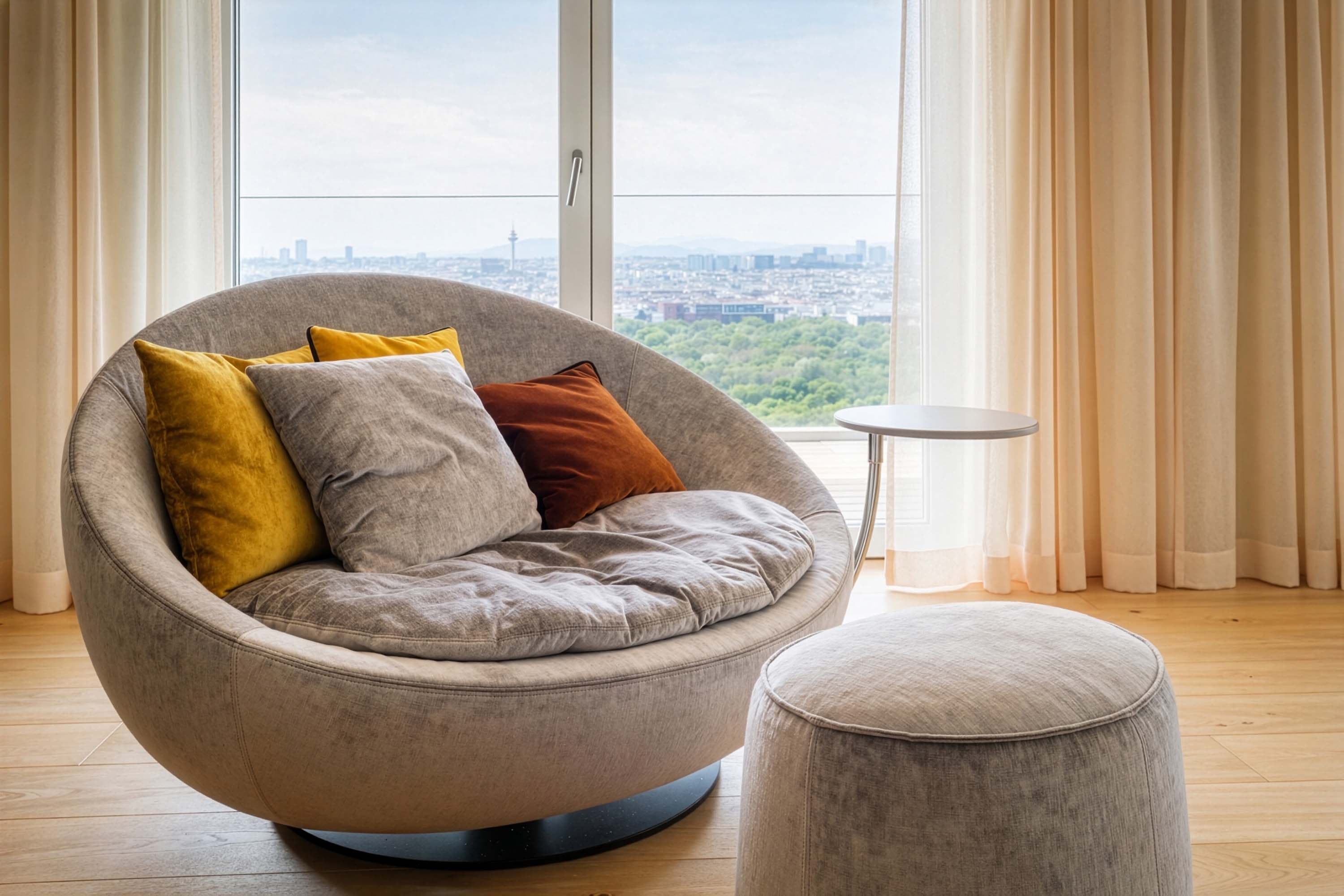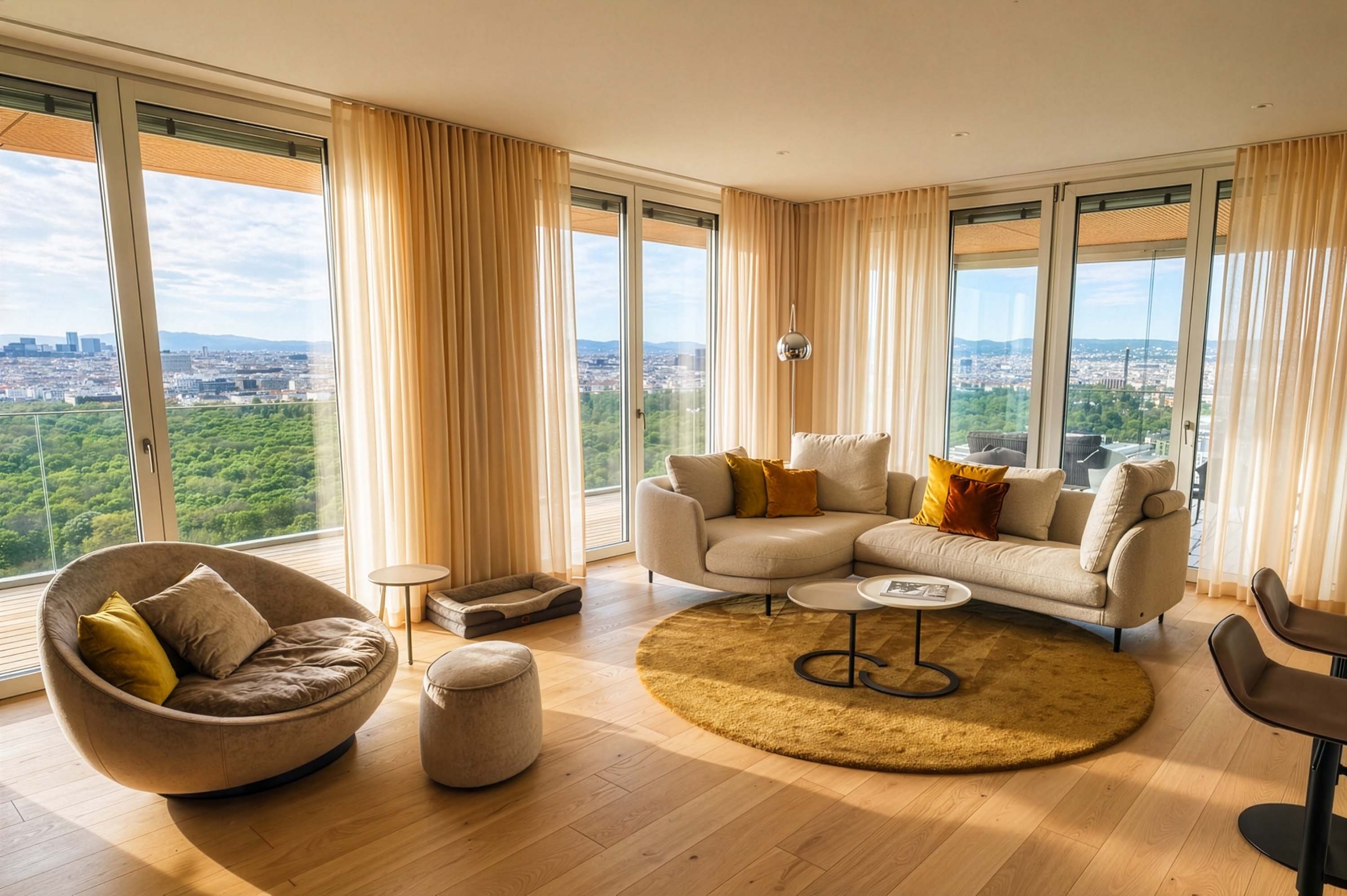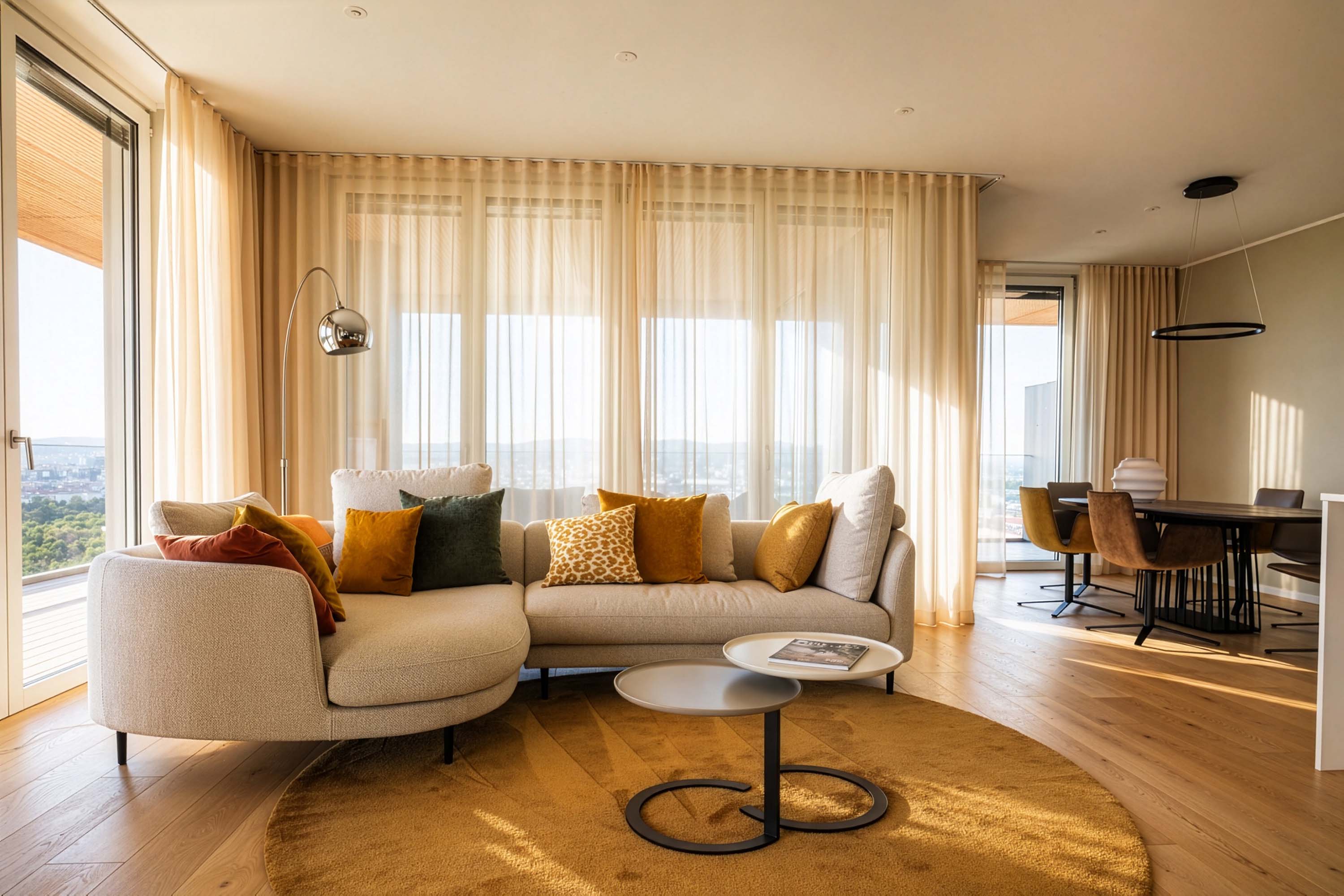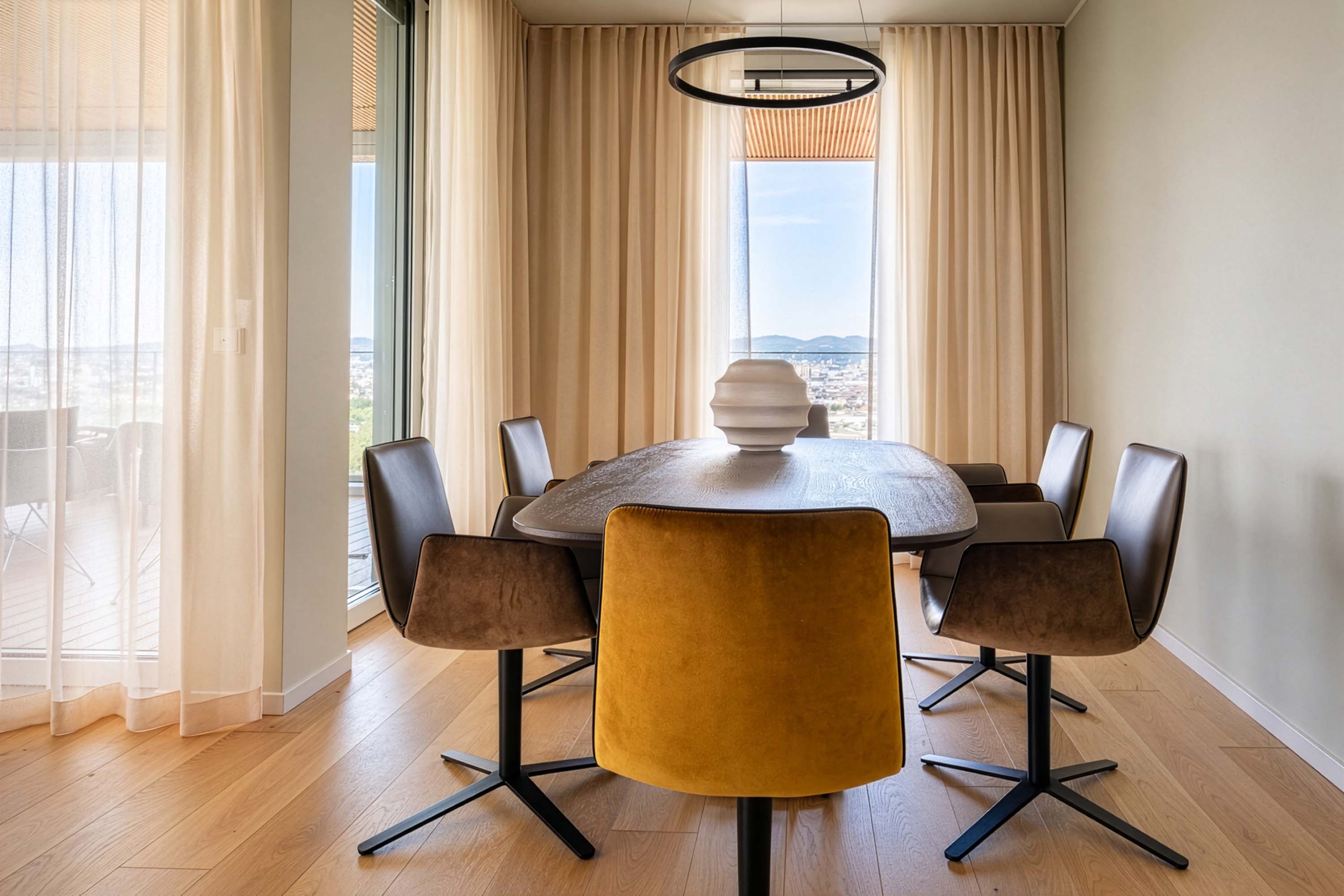 Diesen großzügigen, offenen Wohn-Essbereich eines Apartments mit traumhaftem Blick hoch über den Dächern Wiens durften wir kürzlich ausstatten. Im Mittelpunkt: ein einladendes Lounge-Sofa von Rolf Benz, kombiniert mit einer Essgruppe von Freifrau und Janua sowie einer gemütlichen Leseinsel von Désirée.